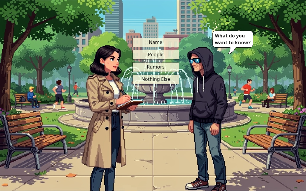 Special dialogue commands are also available to alter choices and timers, allowing them to modify one-another when selected or timed out. These commands can further be used to run conditional, weighted or randomized logic to limit or select available choices — wide power and control in a small package!