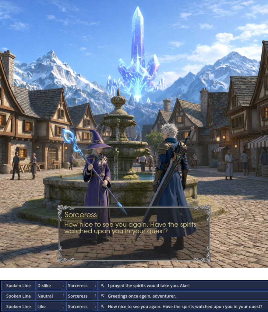 Want a character to speak differently if they’re happy or angry? Want them to only tell a secret if they like the player? Easy: assign a disposition to any line, and it will only be displayed on screen if the speaker’s disposition matches!