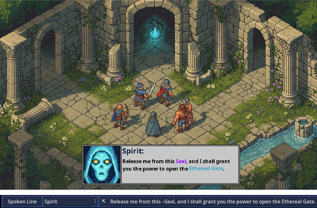 Likewise, if you integrate a Text-To-Speech solution into your game, whether built-in or through an external API, you can let Candy Dialogue Engine use it to speak lines out loud. BBCode and any other tags will be automatically omitted when passing a line to your TTS tool, or you can write and pass specially-written TTS line variants for fine-tuning of rhythm, tone, and other speech parameters!