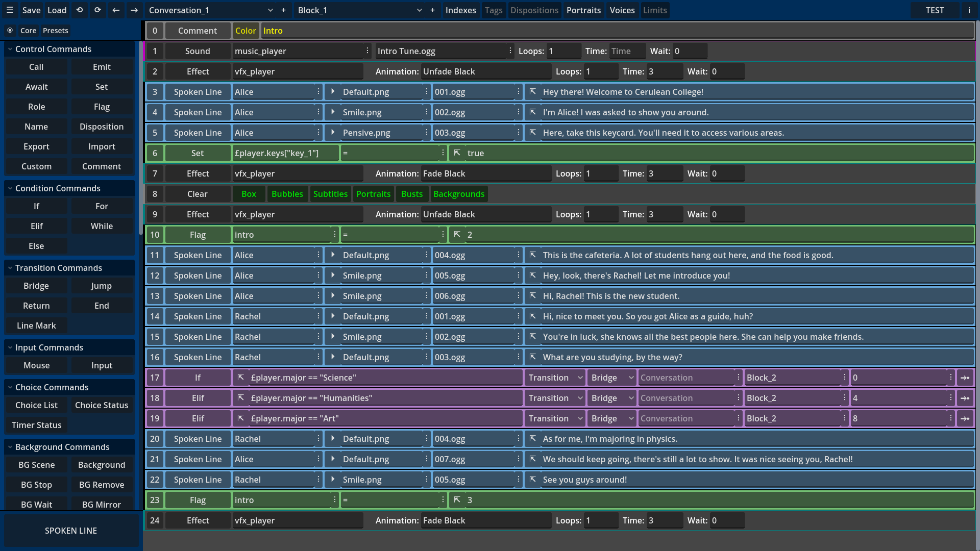 No programming required, and no syntax to memorize: just create Conversations and Blocks, add Lines, and fill their data fields as needed.